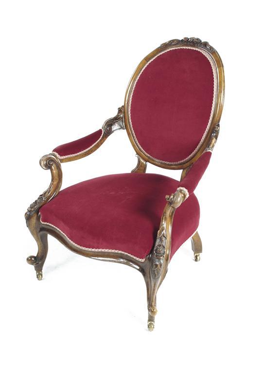 A Victorian carved walnut easy open armchair, on replaced brass castors.