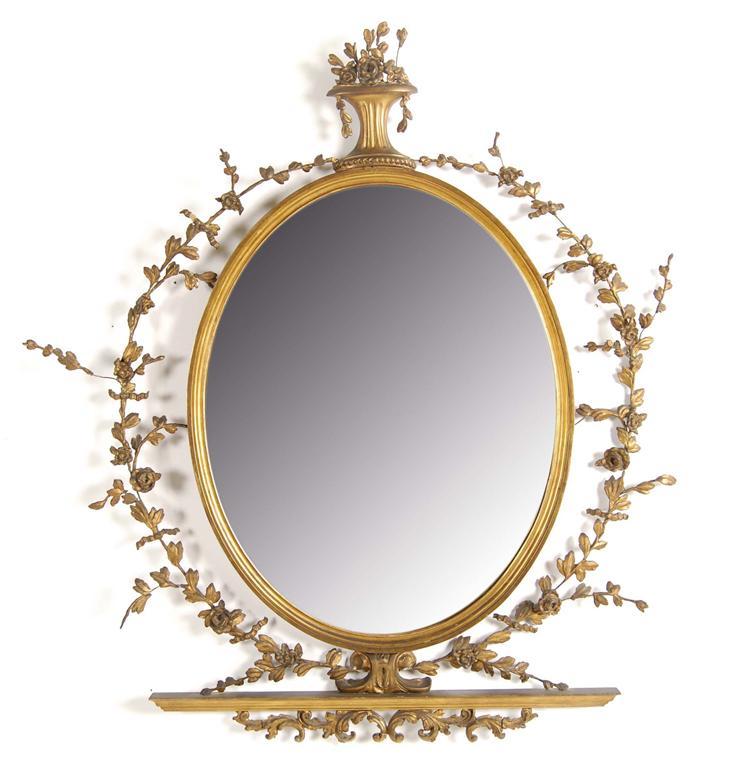 A gilt wall mirror in Hepplewhite style, the oval plate to a moulded frame with leaf and flower outer borders to an urn surmount, 46in (116.8cm) h, 42in (107cm) w.