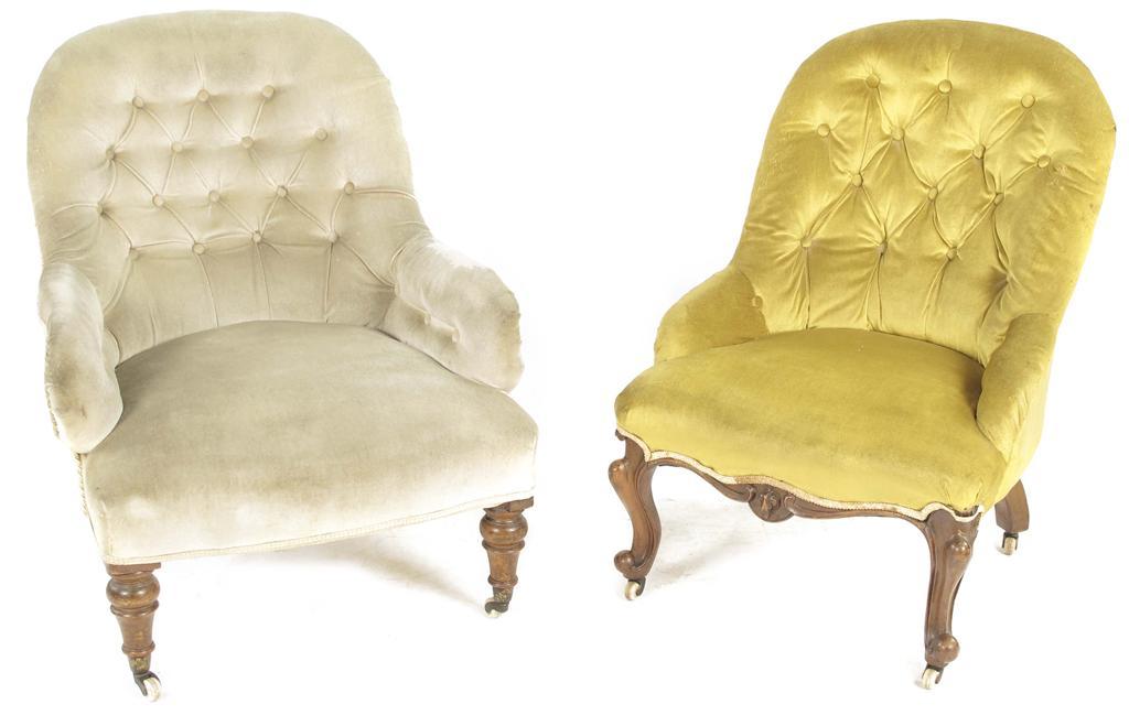 Two Victorian easy armchairs, both with button upholstered backs. (2)