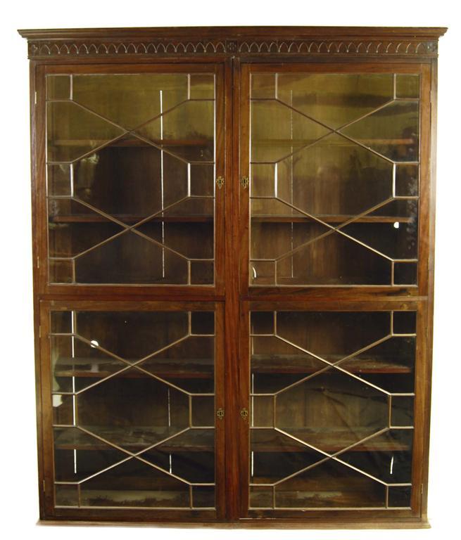 A mahogany bookcase, the oak cornice carved pendants and quatrefoil motifs above two astragal glazed doors to each section enclosing adjustable shelves, George III elements but adapted, 86.5in (219.5cm) h, 71.5in (181.7cm) w, 13.25in (34cm) d.
