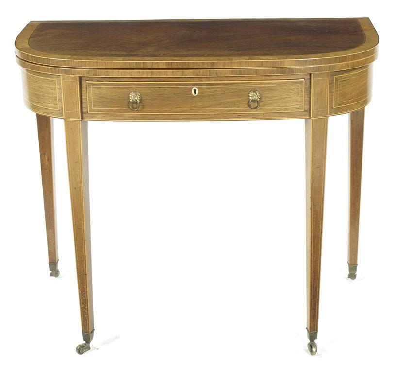 An early 19th century rosewood tea table, with a bird's eye maple bounded top with boxwood stringing, hinging on twin supports above a part divided frieze drawer with an ivory escutcheon and later brass handles on square tapering legs on brass castors, 29.5in (75cm) h, 34.75in (88.5cm) w, 18in (45.5cm) d.