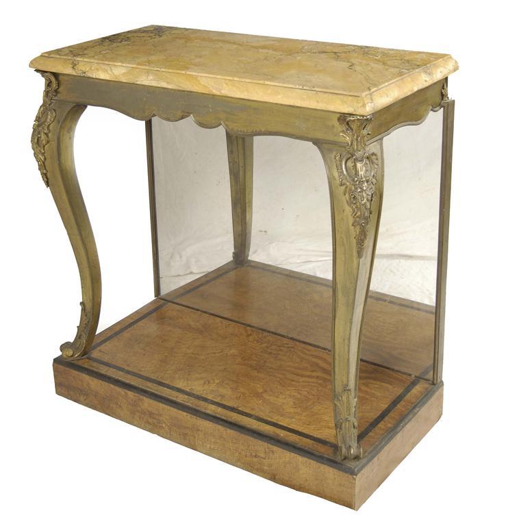 An early 19th century gilt brass and oak console table, the moulded edge Siena marble top above a shaped frieze to cabriole legs with foliate and rocaille mounts, the mirrored back to a a plinth base inlaid ebonised stringing, 35.75in (90.8cm) h, 35.5in (90cm) w, 17.5in (44cm) d.