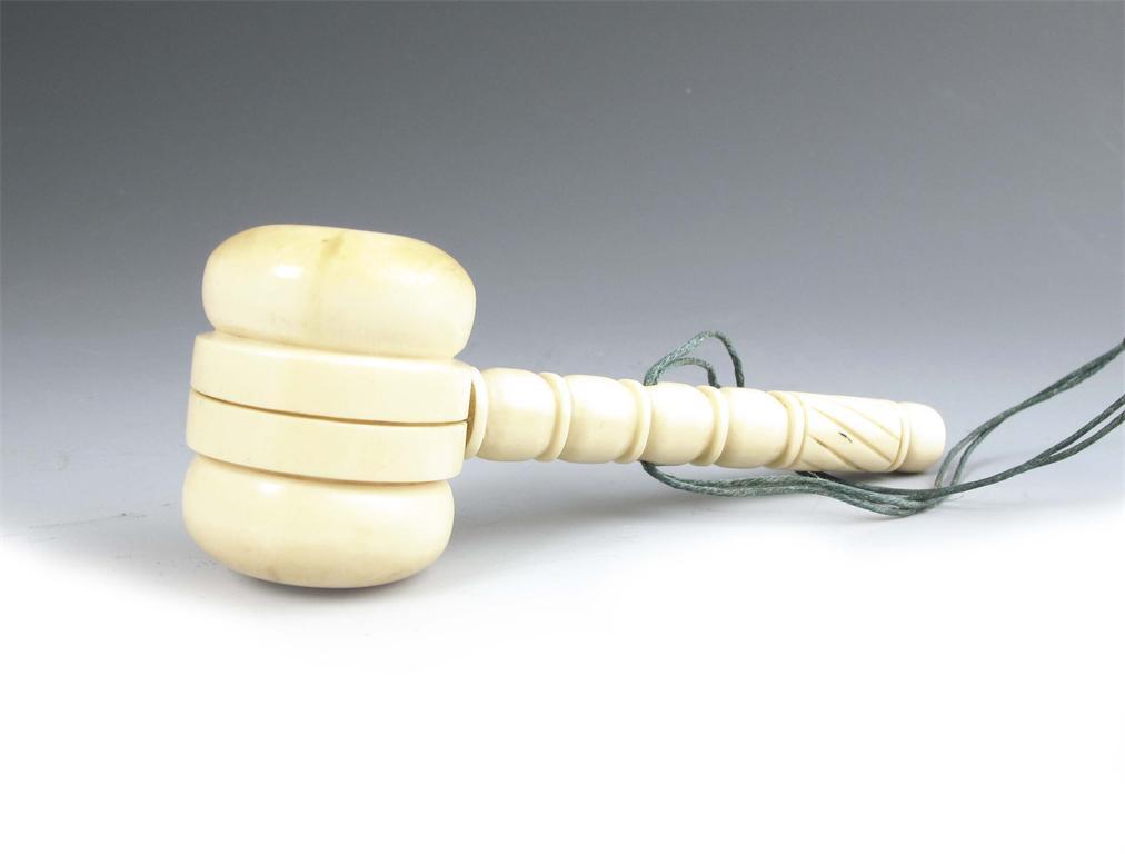 A turned and incised ivory gavel, with a pierced hole through the handle, 4.75in (12cm) l.