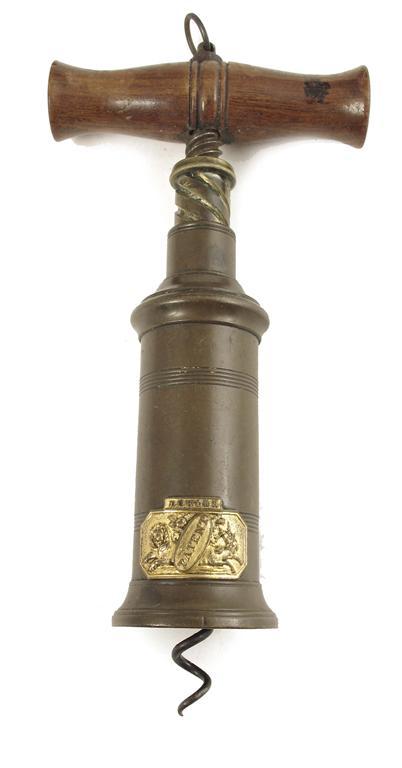 A Thomason type corkscrew, with a turned wood handle and a bronze barrel with applied tablet marked 'DOWLER, PATENT' with lion and unicorn supporters.
