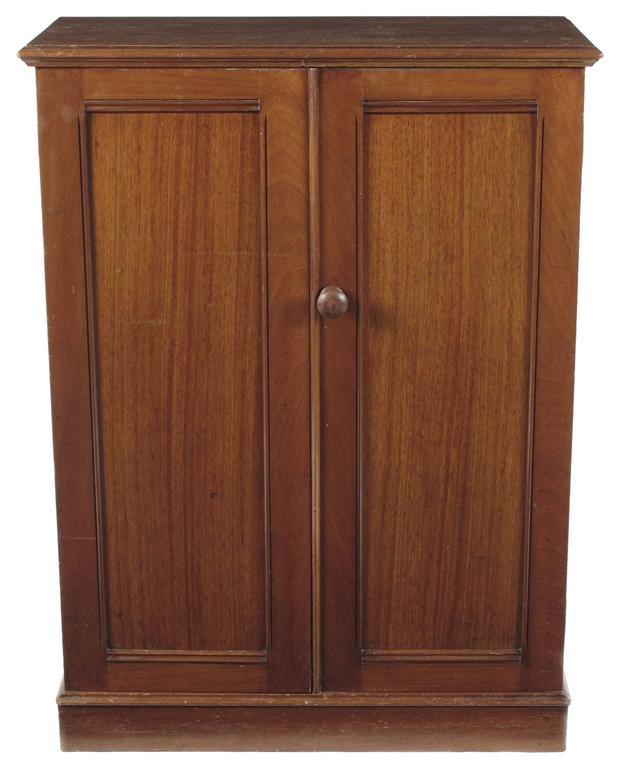 A Victorian mahogany cabinet, with a pair of rectangular panel doors enclosing three fixed shelves, 39in (99cm) h, 28.75in (73cm) w,12.75in (32.5cm) d.