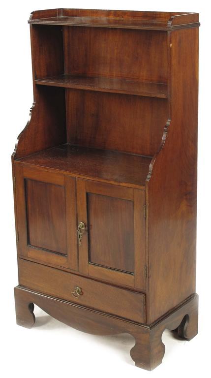 A Victorian mahogany cabinet, the open shelved top above a pair of panelled cover doors and a drawer, 43.5in (110cm) h, 23.25in (59cm) w, 12in (30.5cm) d.