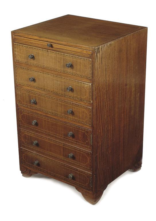 A mahogany chest by Rowley, with boxwood and chequer stringing, having a slide above three drawers and a cupboard door with false drawer front, on stepped bracket feet, one drawer with label, 30.75in (78cm) h, 19in (48.5cm) w, 17in (43cm) d.