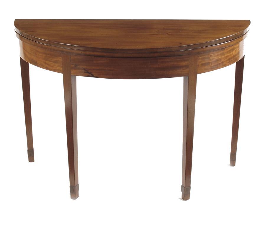 An early 19th century mahogany tea table, with demi-lune hinged top on square tapering legs with applied angles, 27.75in (70.5cm) h, 42.25in (107.5cm) w, 18.75in (47.5cm) d.