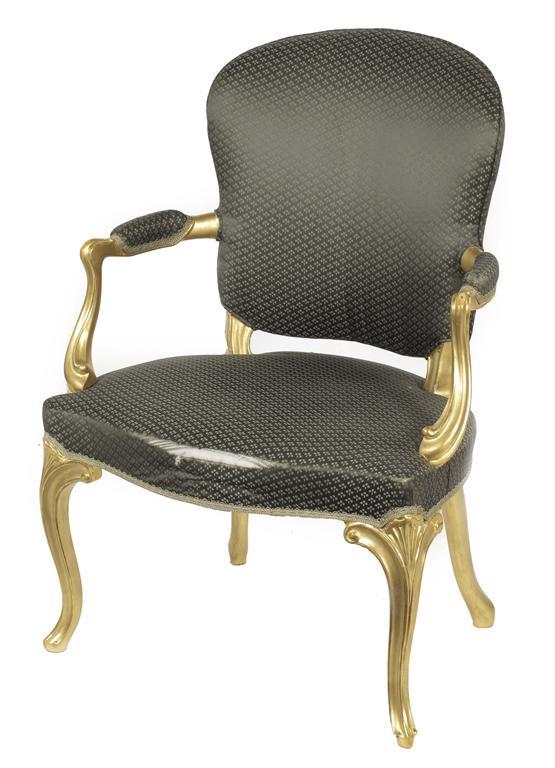 A Hepplewhite giltwood open armchair, upholstered in a pattern green silk, with padded scroll arms and shell capped cabriole legs.