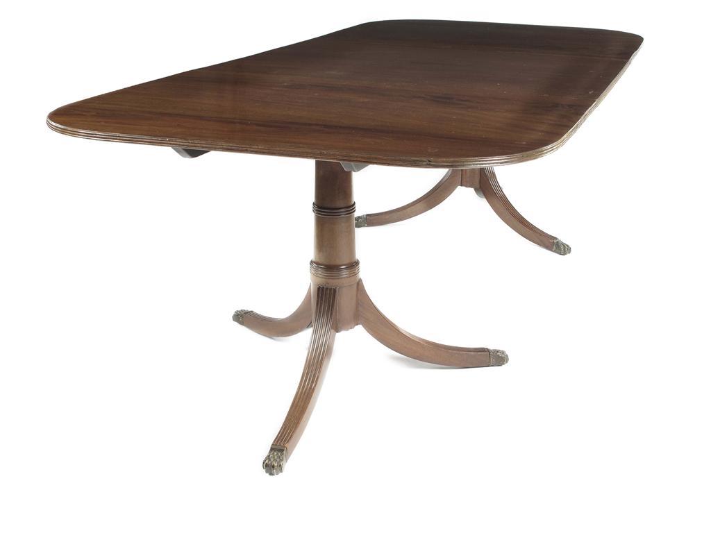 A mahogany twin pedestal dining table in late George III style, the reeded edge 'D' end tilt-tops with an extra leaf, on turned barrel and reeded splay legs, 28.5in (72.5cm) h, 95.5in (242.5cm) l, 44.75in (113.5cm) w.