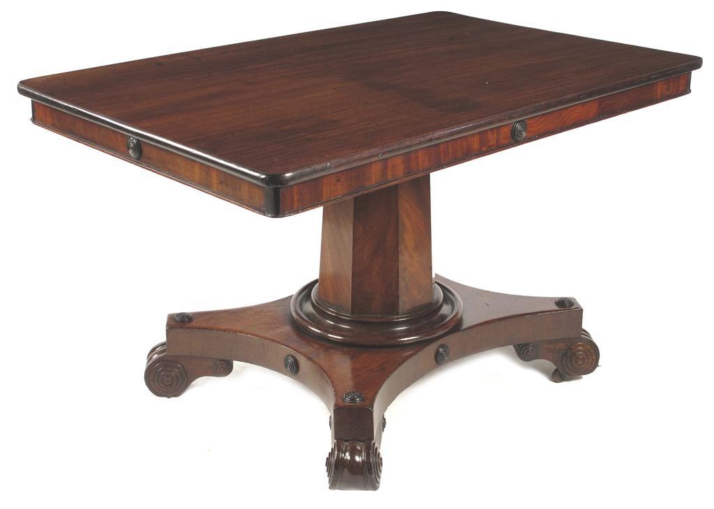 A William IV mahogany centre table, with applied ebonised rondels, the re-positioned rectangular top on a faceted stem, on a quatreform base with scroll feet and later castors, 27.5in (70cm) h, 47.5in (120cm) w, 30in (76.5cm) d.