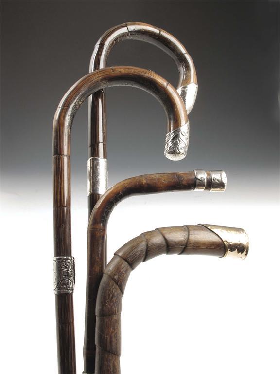 Four crook handled walking canes, comprising: a late Victorian bamboo sword stick with silver mounts, hallmarked London, 1898, 36.25in (92cm) l; and three palmwood canes two with silver mounts, hallmarks for London, 1907 and 1913 respectively. (4)