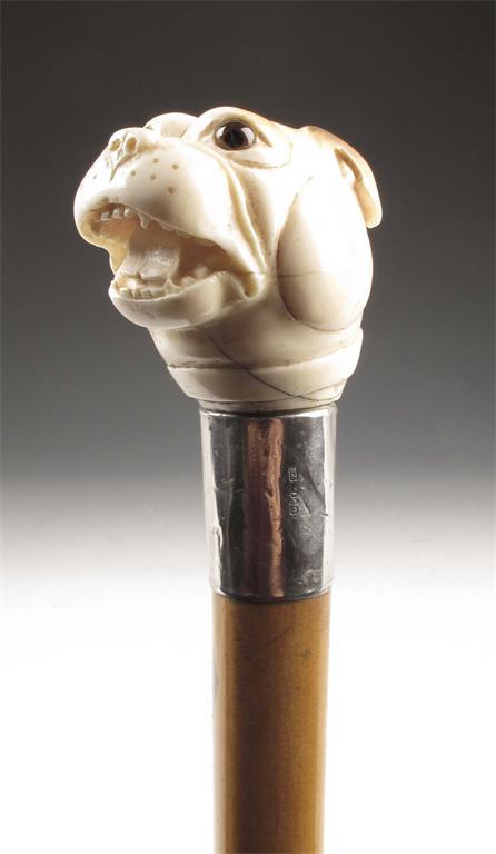 A late Victorian malacca walking cane, the ivory handle carved in the form of a Bulldog's head, with glass eyes, the silver ferrule with a monogram, hallmarked London, 1884, 35.75in (90.6cm) l.