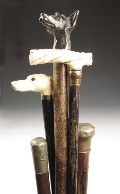 Five walking canes, comprising: one with an ebonised shaft and a dog's head handle, 36in (91.3cm) l; a palmwood cane with an ivory naturalistic handle and an 18ct gold ferrule; a copper dog's head handled example; and two nickel handled canes one embossed 'REC with wings crowned'. (5)
