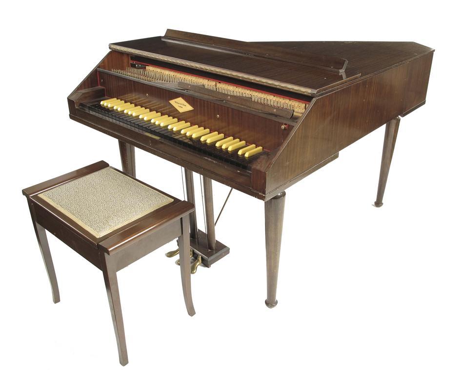 A mahogany spinet by William de Blaise, London, No.267, on turned beech legs, 35.5in (90cm) h, 56.5in (143.5cm) d, 41.75in (106cm) w., with a stool. (2)