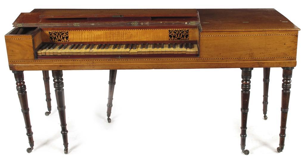 An early 19th century mahogany and parquetry banded square piano by Wilkinson & Co London, No. 2065, the hinged cover revealing a satinwood banded and pierced interior with ivory and ebony keys, the back inscribed 'Wilkinson & Co Late Broderip & Wilkinson, No. 13 Hay Market, London', 31.75in (81cm) h, 65.5in (166.5cm) w, 23.25in (59cm) d.