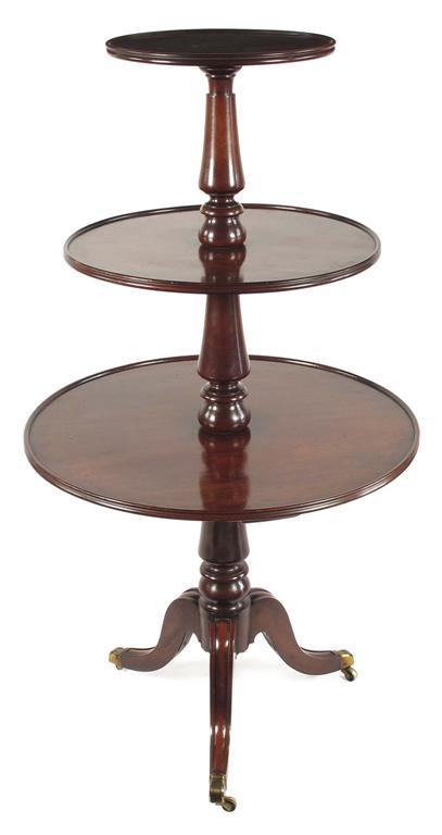 A George IV mahogany three tier dumb waiter, with turned baluster supports and moulded tripod base, the two lower tiers revolving, 54.5in (141cm) h, 29in (73.5cm) dia.