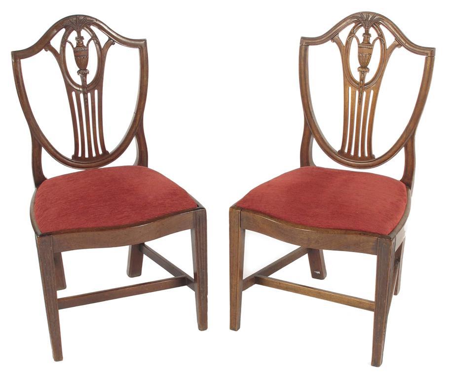 A pair of early 19th century mahogany shield back side chairs, with carved urn and wheat sheath. (2)