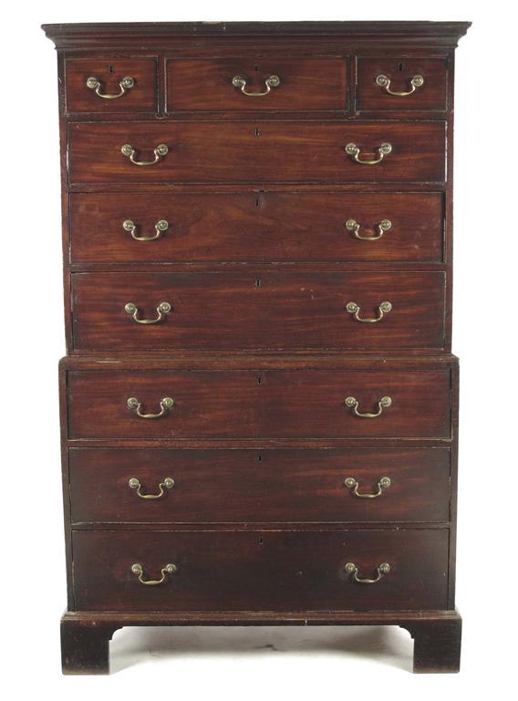 A George III mahogany chest of chest, with oak lined drawers and brass swan neck handles, 73.5in (187cm) h, 46.5in (118cm) w, 22.5in (57cm) d.