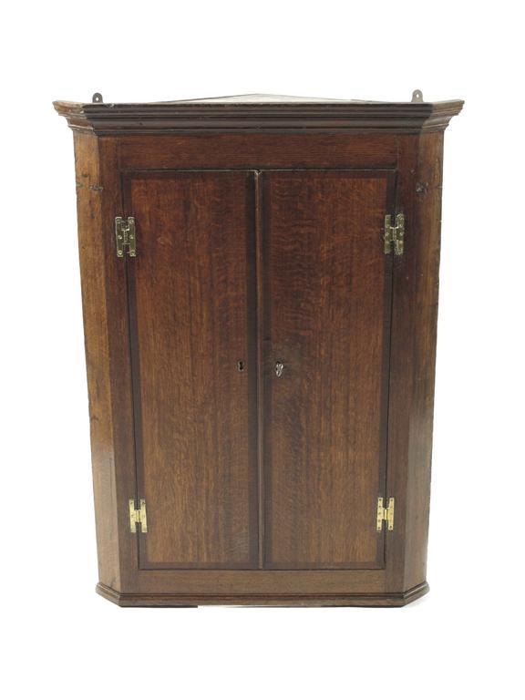 An early 19th century oak hanging corner cupboard, with a pair of mahogany crossbanded doors enclosing three shaped shelves, 43in (109cm) h, 31.5in (80cm) w, 18in (46cm) d.