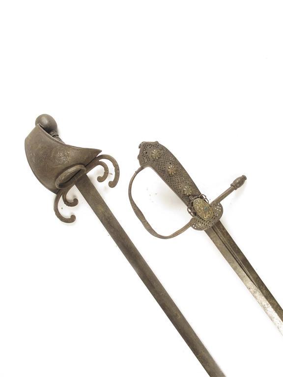 A German sword, with a 33inch blade marked 'SOLINGEN' with a pierced handle having applied florets, and another sword with a floral engraved hand guard, 39.5in (100.5cm) l. (2)