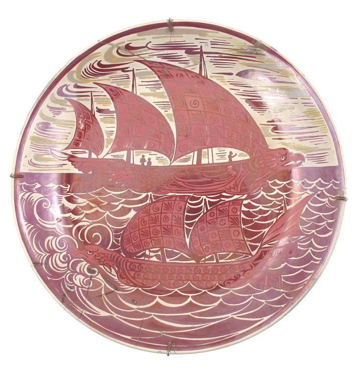 A William De Morgan charger, painted with a scene of two ships at full sail, in ruby, copper and sand lustre impressed 20, smashed and repaired 36cm. diam.