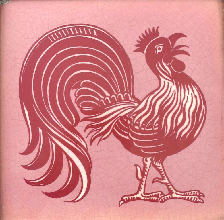 A large William De Morgan Cockerel tile, painted in ruby lustre on an unusual pale pink ground, framed unsigned, small chip to one corner 21cm. square