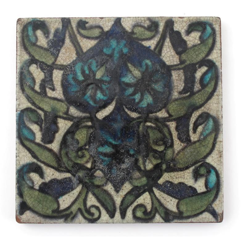 A William De Morgan New Persian No.2 tile, on Carter's Poole blank, painted in shades of green, blue and white impressed marks, minor chips to corners 15.5cm. square