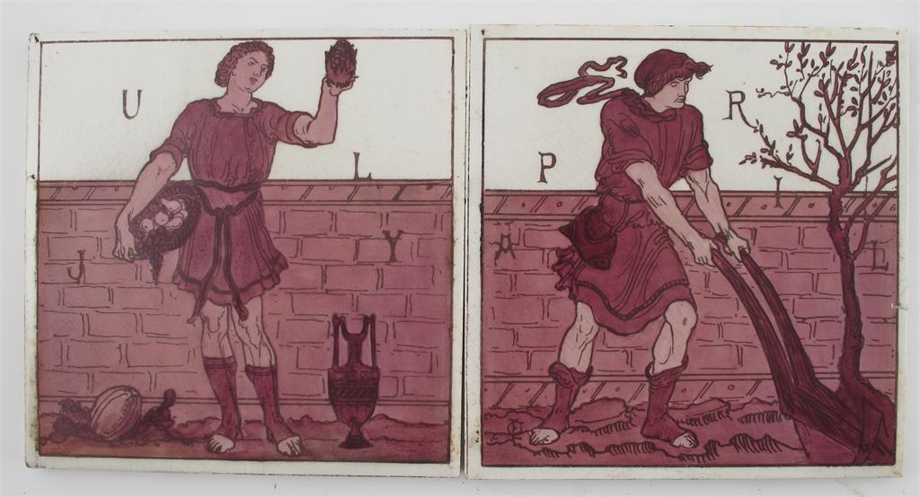 A pair of Craven Dunnill tiles, depicting April and July, printed and painted in red on a white ground impressed factory marks to reverse 15.5cm. square