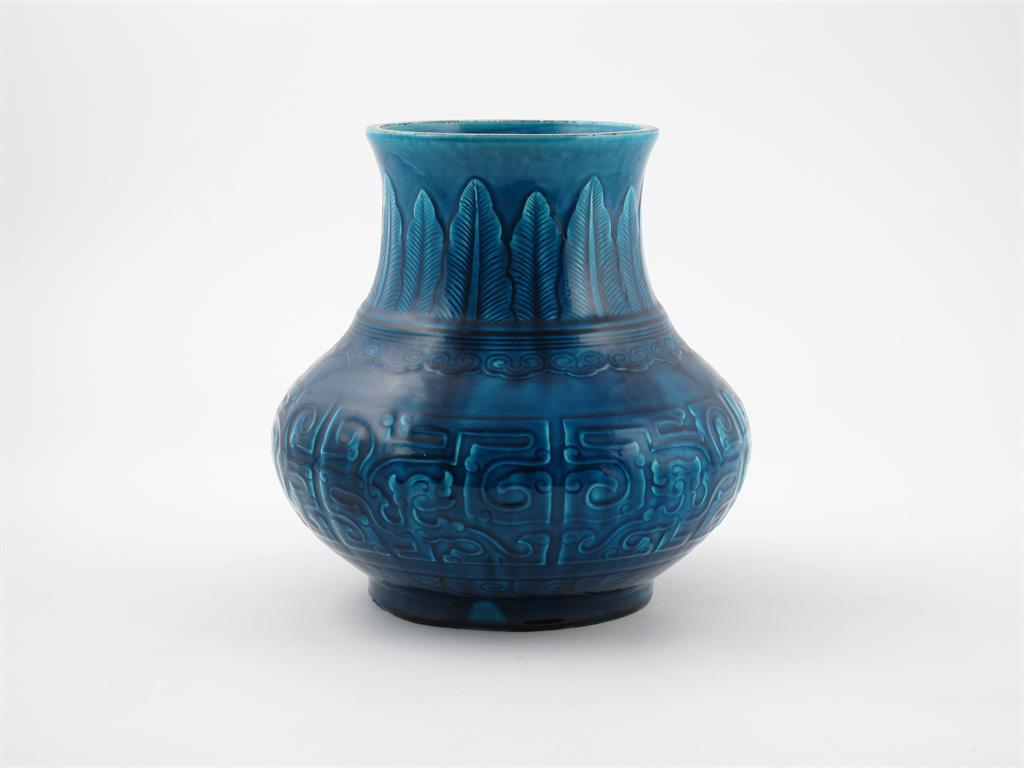 A Theodore Deck vase, ovoid with waisted neck, modelled in low relief with archaic motif, glazed turquoise impressed marks, glaze frits 26cm. high