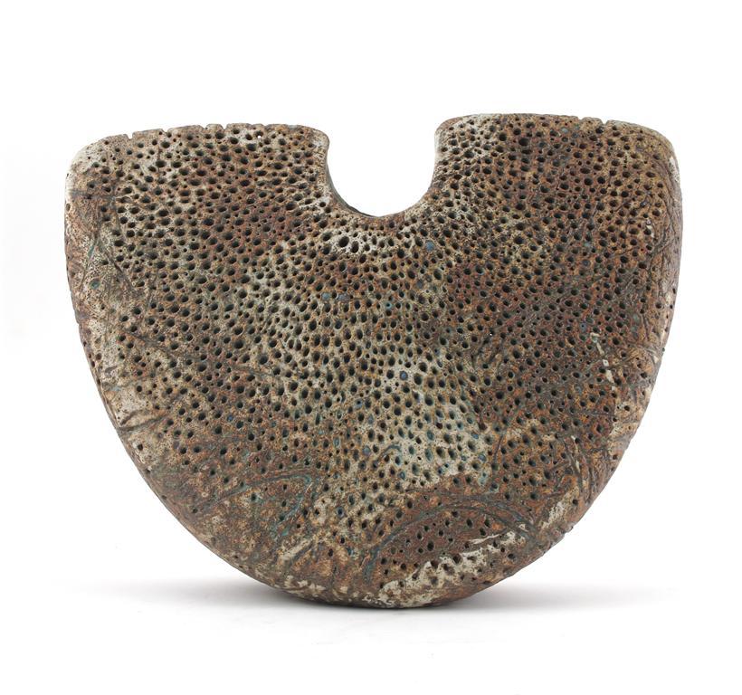 Alan Wallwork (born 1931) a large stoneware split form vase, glazed ochre, brown and blue incised AW 40cm. wide