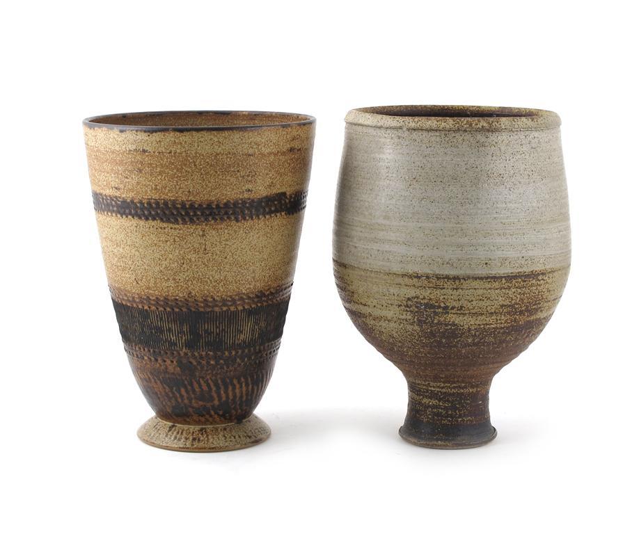 a stoneware vase dated 1962, with incised bands, spray glazed rust and ochre, and a Gwilym Thomas vase incised marks 29.5cm. high
