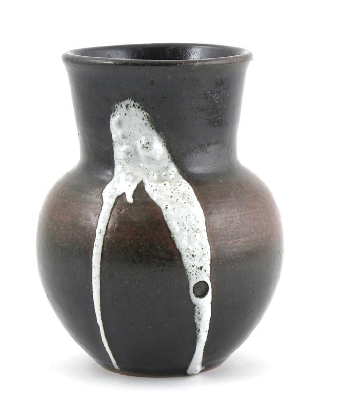 Poh Chap Yeap a shouldered ovoid vase with flaring rim, glazed tenmoku with thick volcanic white splashes painted Yeap 18cm. high