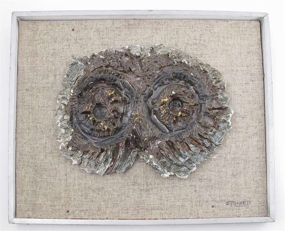 A David Sharp, Rye owl plaque, glazed in colours, mounted and framed signed frame 56 x 48cm. Provenance David Sharp, Rye Pottery