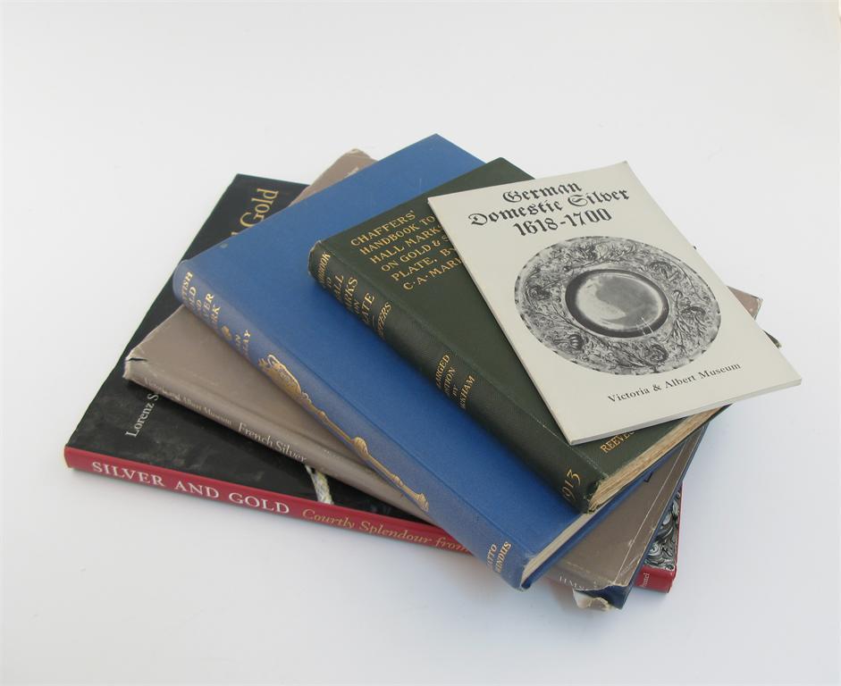 A quantity of assorted silver-related reference books, pamphlets and publications, including Markham, C A; Chaffers' Handbook to Hallmarks on Gold and Silver; Goldsmiths & Silversmiths, by Hugh Honour; French Silver 1450-1825, by Frank Davis; and various other titles. (qty)