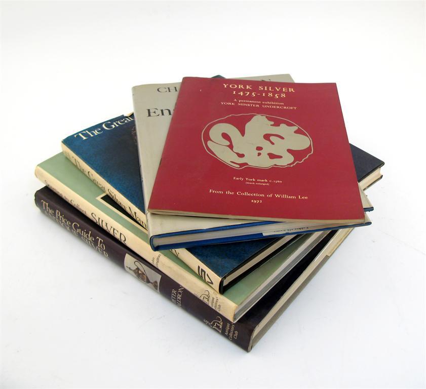 A collection of assorted silver-related reference books; including Oman, C; Engraved English Silver 1150-1900; George Wickes Royal Goldsmith 1698-1761, by Elaine Barr; English Provincial Silver, by Margaret Holland; and a quantity of other volumes and titles. (qty)