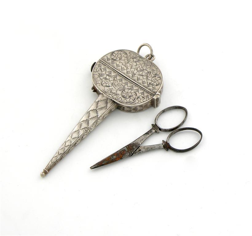 finely engraved with cherubs, and foliate scroll decoration, the tapering stem with hatched diaper decoration, steel push button opening, with a pair of later scissors, length 9.5cm, approx. weight 0.6oz.
