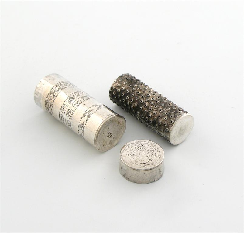 cylindrical form, the cover engraved with a rose, the body with four bands of engraved decoration, pull-out tubular grater, length 5.2cm, approx. weight 0.8oz.