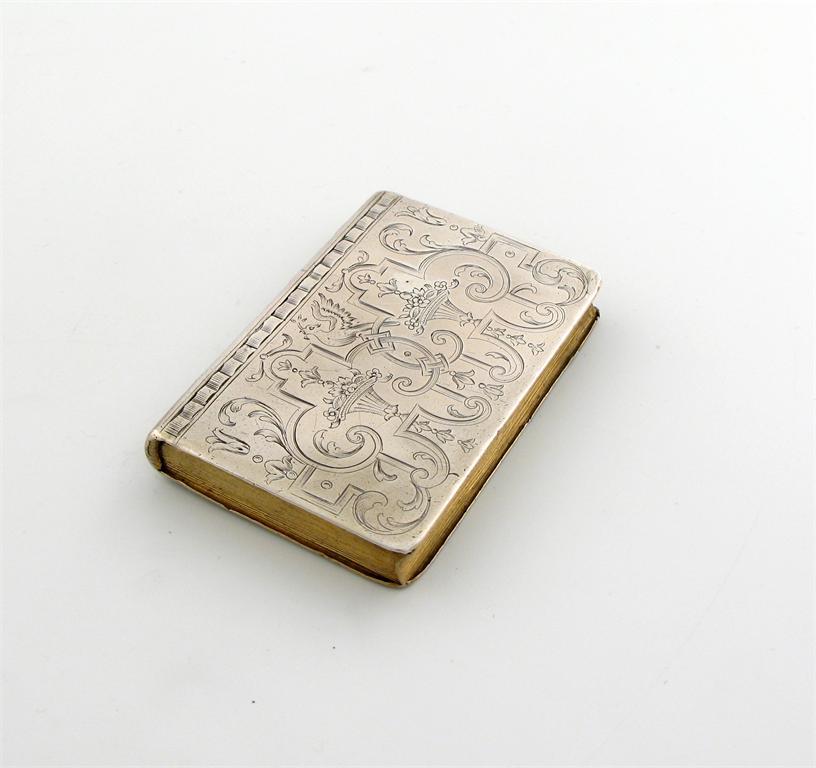 rectangular form, engraved with urns of flowers and foliate scroll decoration, flush hinged cover, gilded interior, the spine inscribed 'THE DAYLY (P)RACTICE', length 7.4cm, approx. weight 2.3oz.