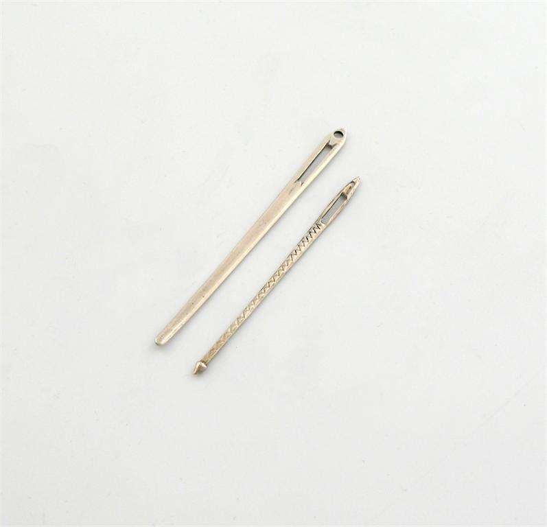 A small George III silver bodkin, by Samuel Pemberton, Birmingham circa 1800, plain tapering form with an eye and slot, plus a small George III silver bodkin, circa 1790, approx. weight 0.9oz. (2) Purchased from Phillips, London, 19 January 1979.
