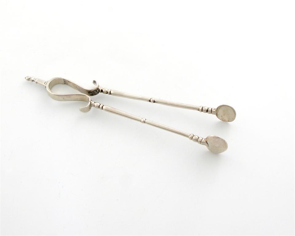 A pair of George I silver 'andiron' sugar nips, possibly by John Hopkins, London circa 1720, double 's' scroll spring, oval bowls, baluster stems, length 12.8cm, approx. weight 0.6oz. Purchased from Penman, 13 April 1979.