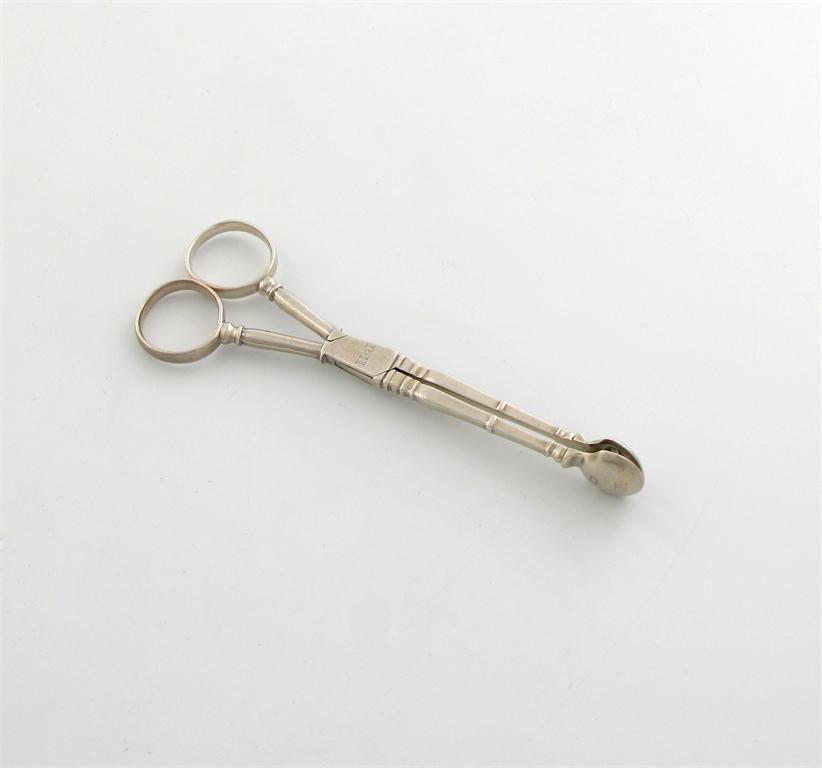 A pair of George I silver sugar nips, by Robert Cates, London circa 1725, ring handles, square section tapering stems, fan shaped bowls, 11.3cm, approx. weight 0.7oz. Purchased from Phillips, 7 August 1981.