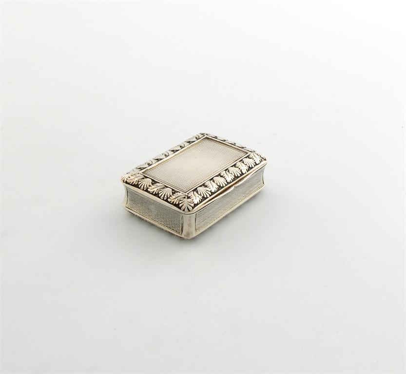 A George III silver snuff box, by Daniel Hockley, London 1813, rectangular form, engine turned decoration, with a foliate shell border on a matted background, length 6.7cm, approx. weight 3oz.