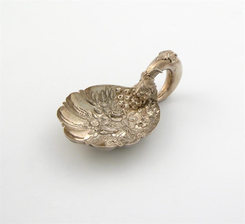 A Victorian silver caddy spoon, by George Unite, Birmingham 1868, shaped oval bowl, embossed foliate decoration, leaf capped scroll handle, length 7.2cm.