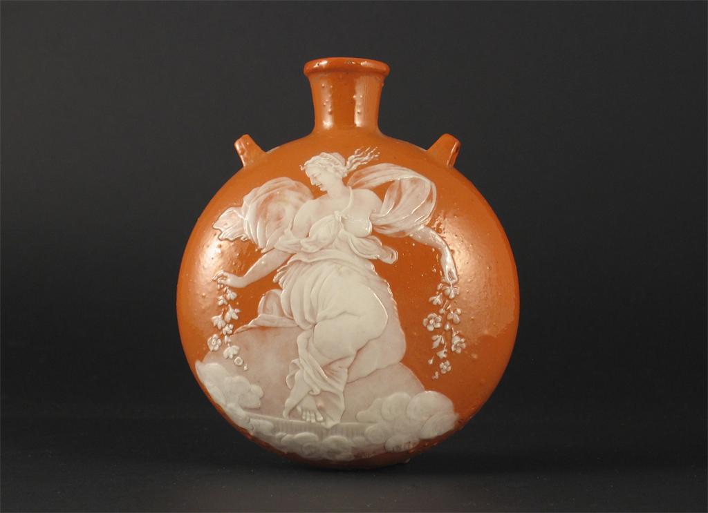 A pte-sur-pte circular flask, decorated with Flora scattering flowers, signed 'Cope' and dated 1877. A small rim chip and some spitting to the glaze. 13cm.