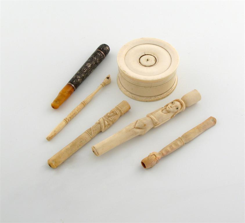 A small collection of ivory items, comprising: a box of circular form, central button, pull-off cover, three cigarette holders, an amber cigarette holder and a carved had with a spy glass with scenes of Paris. (6)