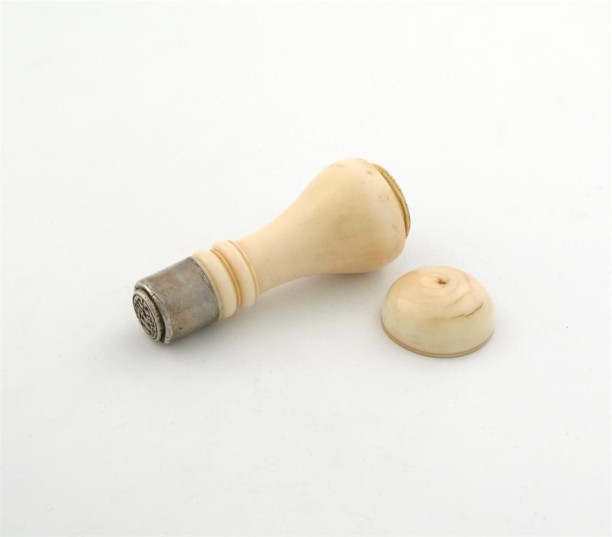 A 19th century silver mounted ivory desk seal, unmarked, the baluster handle has a screw opening top, which opens to reveal a compartment. length 9cm.