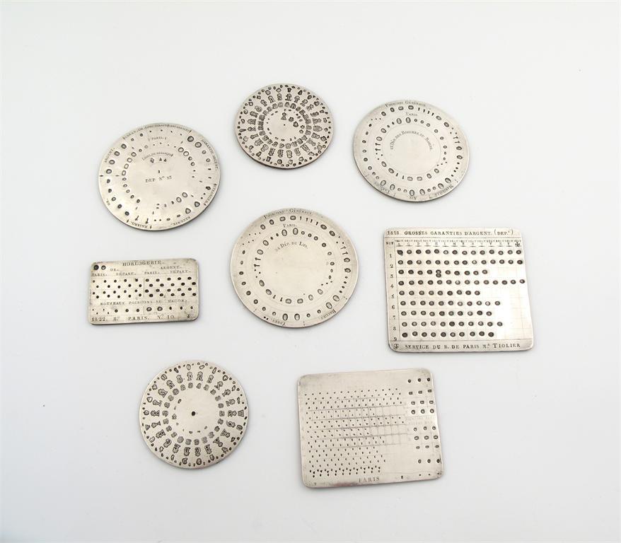 each with various hallmark stamps of the period, including a rectangular one titled '1818 Grosses Garanies D'Argent (Deps.)', one circular, titled: 'Poincons Generaux', 'Bruges' and 'Ypes', one titled 'Marseille', 'Aix' and 'Tarascon',one with Dept.13, two circular ones with date letters, and two others, diameter of largest 7.9cm. (8)
