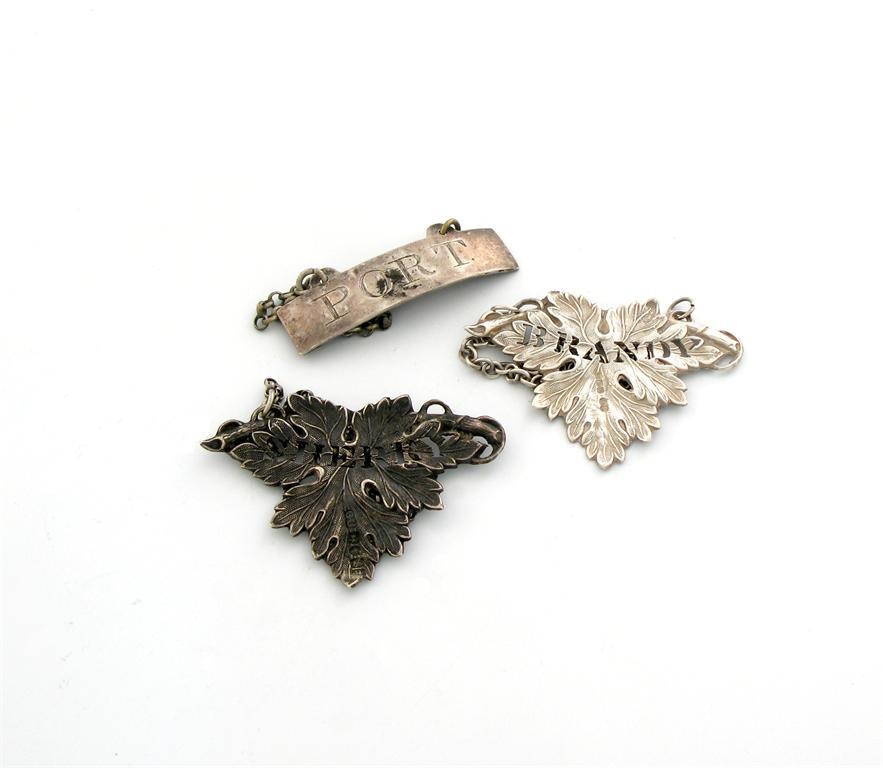 A George III silver wine label, by Phipps and Robinson, London circa 1800, rectangular form, incised 'PORT', plus a George Unite vine leaf label, pierced 'SHERRY' and a modern vine leaf label pierced 'BRANDY'. (3)