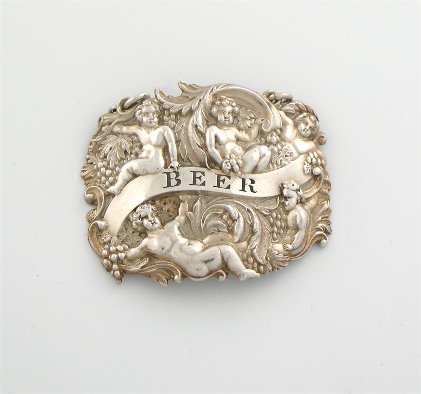 A Victorian silver beer label, maker's mark of S.M, London 1840, oval foliate form, with four cupids and bunches of grapes, pierced 'BEER', length 6.3cm.